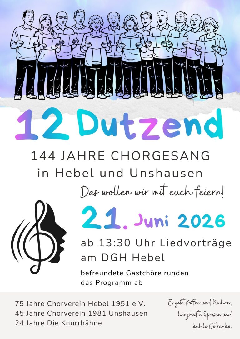 144 Jahre Chorgesang in Hebel und Unshausen, das soll gefeiert werden am 21. Juni 2026 ab 13:30 Uhr am DGH Hebel.