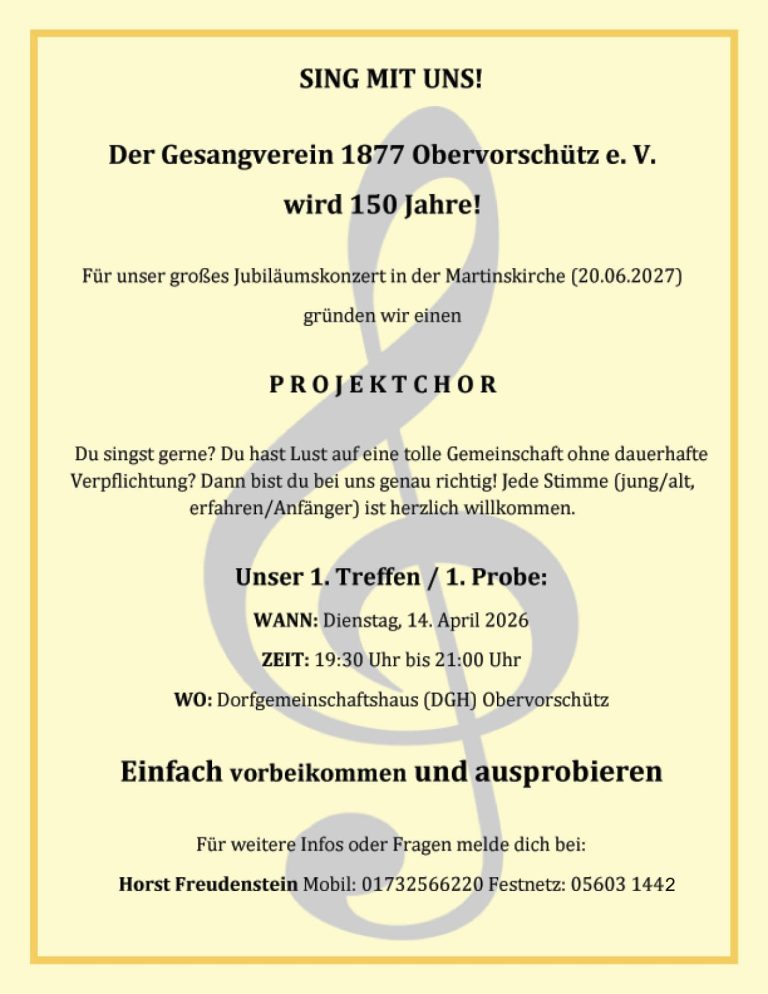 Der Gesangverein 1877 Obervorschütz e. V. wird 150 Jahre. Für das Jubiläumskonzert in der Martinskirche am 20.06.2026 wird ein Projektchor gegründet, zu dem Interessierte herzlich eingeladen sind, mitzumachen. Das erste Treffen findet am Dienstag, 14.04.2026 von 19:30 bis 21:00 Uhr im DGH Obervorschütz statt. Einfach vorbeikommen und ausprobieren.