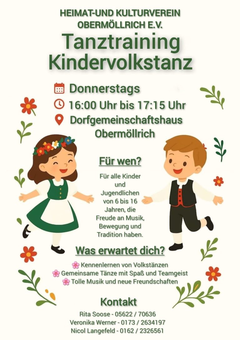 Immer Donnerstags von 16:00 bis 17:15 Uhr trifft sich im Dorfgemeinschaftshaus Obermöllrich die Kindervolkstanzgruppe des Heimat- und Kulturverein Obermöllrich e. V.